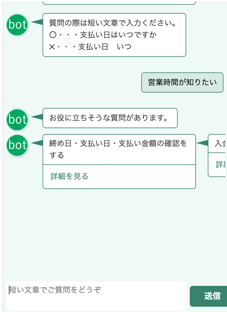 →今までのチャットボットは、営業時間を質問しても複数の回答候補を提示することしかできませんでした。imachika AI Chat なら、ピンポイントで回答内容が提示されます。