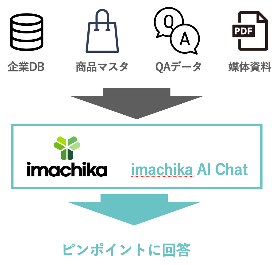 imachika AI Chat は、顧客向け問い合わせ対応だけでなく、社内ノウハウ共有、調べもので利用する媒体資料など、あらゆるデータを統合し、ピンポイントで回答できるサービスです。
