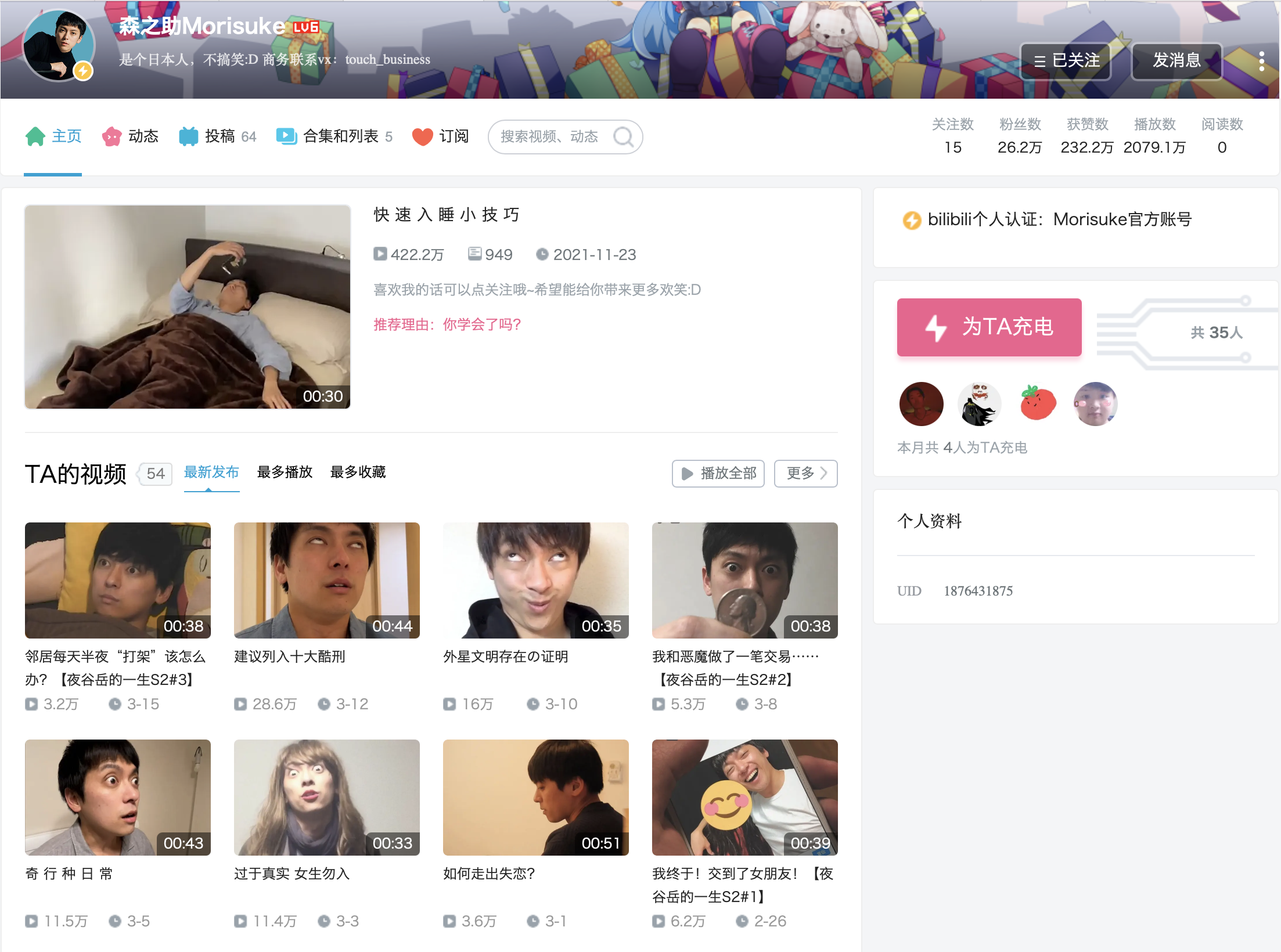 「ソーシャルメディアを使った動画コンテンツを通じて日本と中国をつなげていく」というミッションのもと、中国動画プラットフォームへのクリエイター進出支援を中心としたインフルエンサーマーケティングを展開する TOUCH GROUP株式会社(東京都品川区、代表取締役 原田 静織 以下タッチグループ)の専属クリエイター「morisuke / もりすけ」(中国:森之助Morisuke)が、中国最大級の動画プラットフォーム「bilibili」で2021年度新人クリエイター成長賞を受賞しました。これは、bilibiliでのフォロワー数が10万人以下のクリエイターの中で、期間中のフォロワー増加数が最も多かった10人に贈られるものです。今回受賞した中で、中国人以外のクリエイターはもりすけが唯一です。