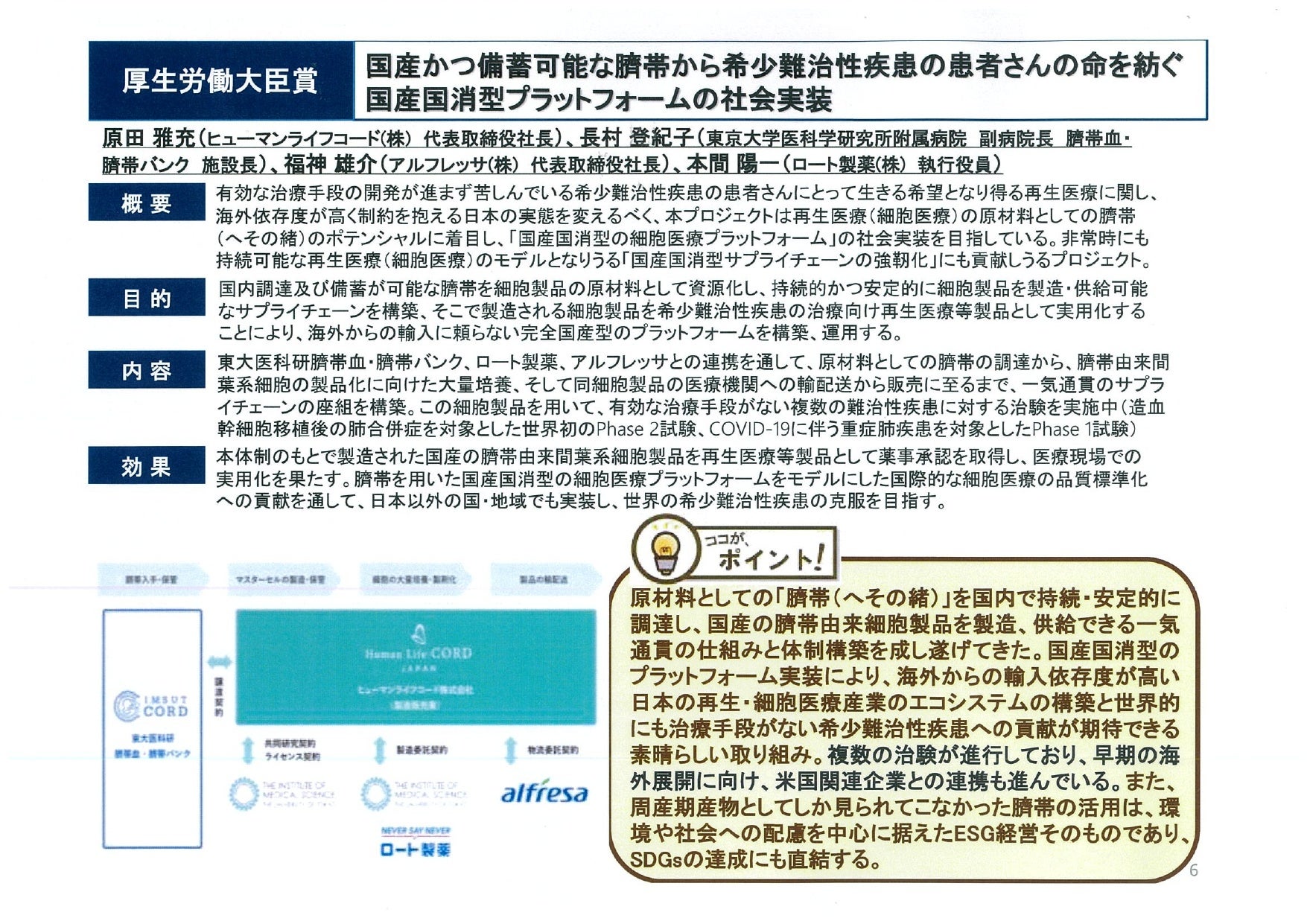 当社がこれまで、東京大学医科学研究所、ロート製薬株式会社、アルフレッサ株式会社との連携を通じて、国産の臍帯(へその緒)を原材料とする細胞医薬品の製品化に向けて取り組んできた成果が評価され、今回の受賞に至りました。