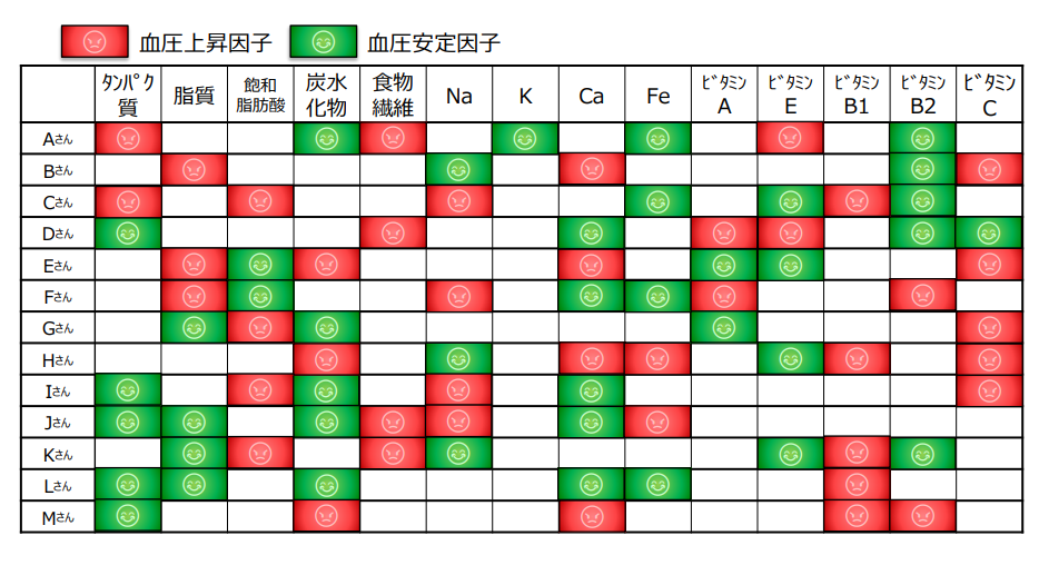 摂取栄養素の善玉因子と悪玉因子は、利用者個人の生活習慣、環境、遺伝的な要因によって大きく異なり、ある人に とっては善玉因子の栄養素が、別の人にとっては悪玉因子になる場合もあります。その一例として信州大学学術研 究院農学系・中村浩蔵准教授との共同研究※では、「血圧低下=減塩」という定説が覆される事例がありました。 「AI 食」技術で解析したところ、“Na(ナトリウム)=塩分”が、むしろ血圧安定因子として判定された被検者が13人 中3人該当しました。被検者に適切な塩分摂取量を反映、減塩せず塩分以外の栄養素を調整して血圧が低下するよ うに設計した一日3食の「栄養最適食」を継続的に提案し忠実に摂取してもらった結果、13人中12人の血圧が低下、 6 人での血圧改善を実現しました。