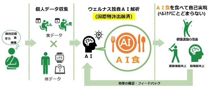 ニュートリッシュは、利用者が設定した目標(健康・美容・運動機能・学力など)に関連する体重・血圧・筋肉量などの生 体データと摂取した食事に含まれる栄養素データを日々記録し、独自の解析アルゴリズムを用いた「AI 食※」技術に より、日々変化する動的な生体データと栄養素データを解析して両者の関係性を明らかにし、生体データに影響する 栄養素(関与因子)を抽出、生体データを改善するために個別最適化された「栄養最適食※」を提供して個人の目標 実現に貢献します(国際特許出願中)。