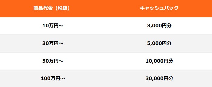 〜対象期間:5/8~6/30の期間中に商品代金10万以上ご注文で金額に応じキャッシュバックキャンペーンを実施(要エントリー)〜