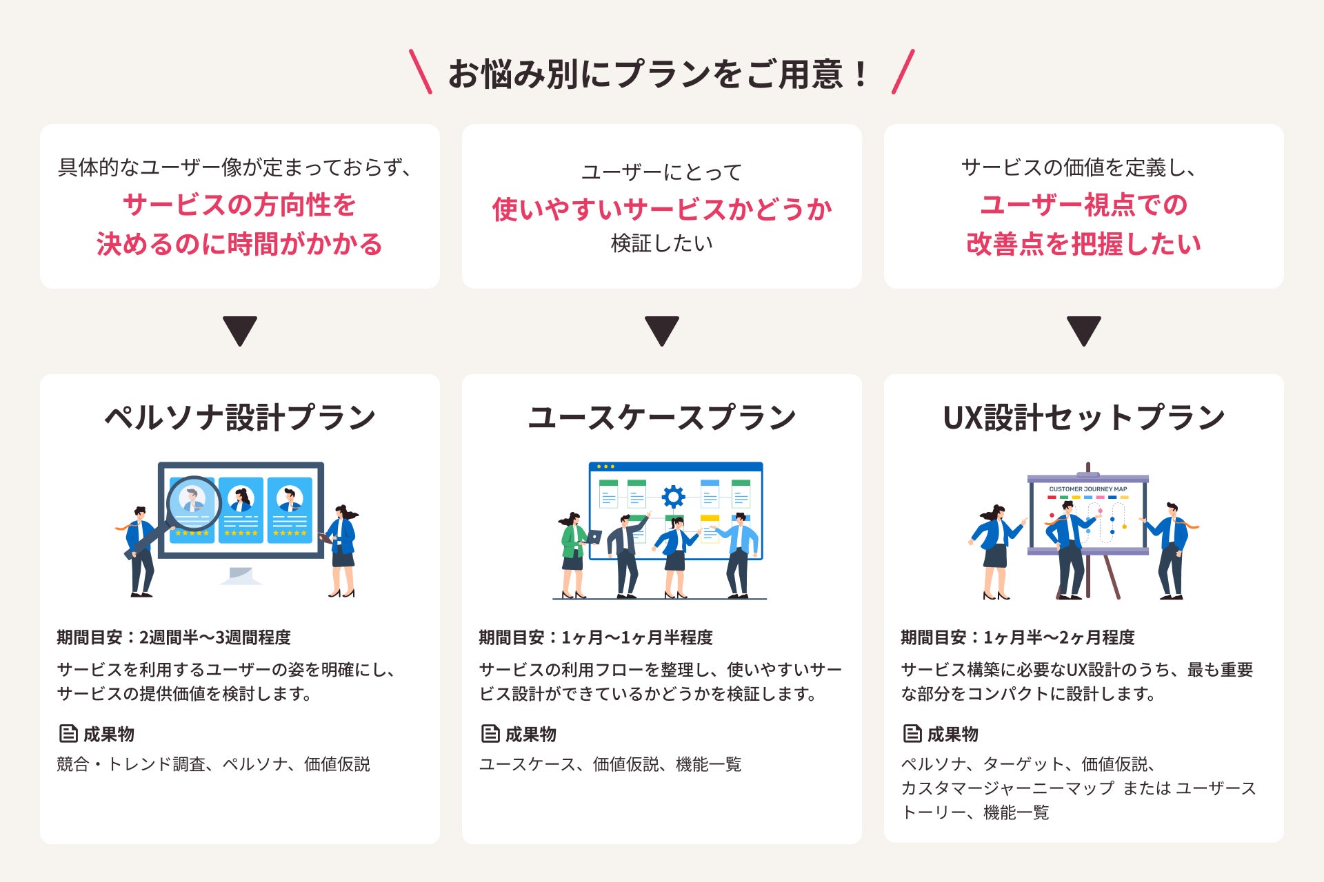 「UXワークショップ」は、お客様のお悩みに合わせて3つのプランをご用意しております。