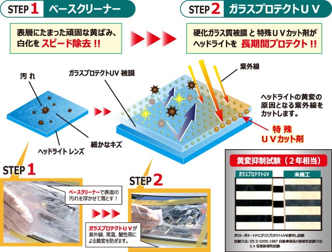 独自開発処方により車やバイクなどのヘッドライトの材質への負担を軽減しています。