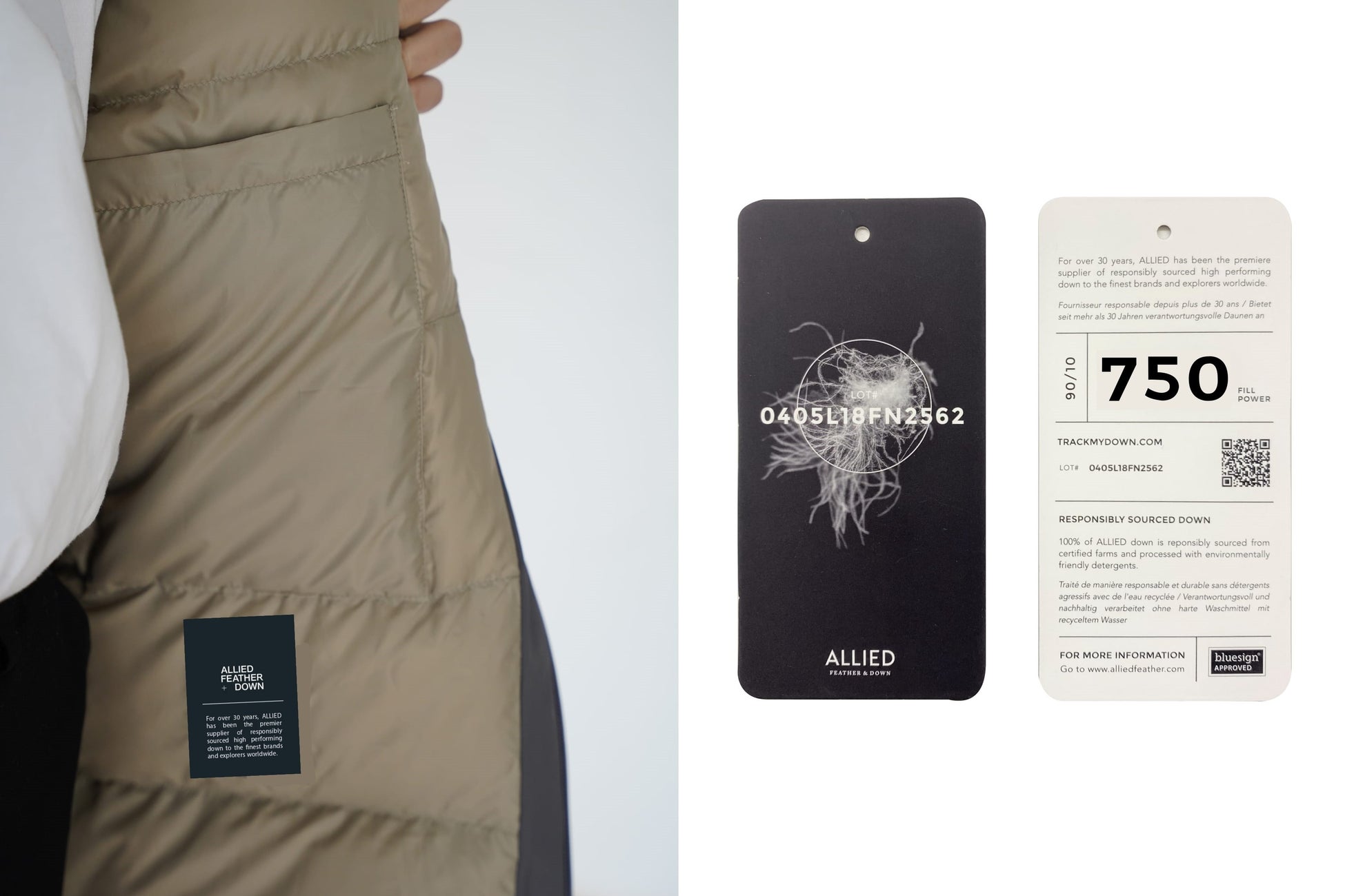 世界でも有数のダウンサプライヤー『ALLIED FEATHER +DOWN』の750 FILL POWER WHITE DUCK DOWN90%を約110g (Lサイズ)使用しています。