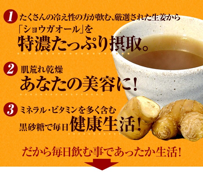 毎日美味しく続くあったかポカポカ生活、ミネラル豊富な黒砂糖とカラダを温める生姜の摂取で、指先足先もあったか。巣鴨のお茶屋さん山年園限定の沖縄黒糖と高知生姜を使用、通常より濃さが5倍のこれぞ生姜湯!