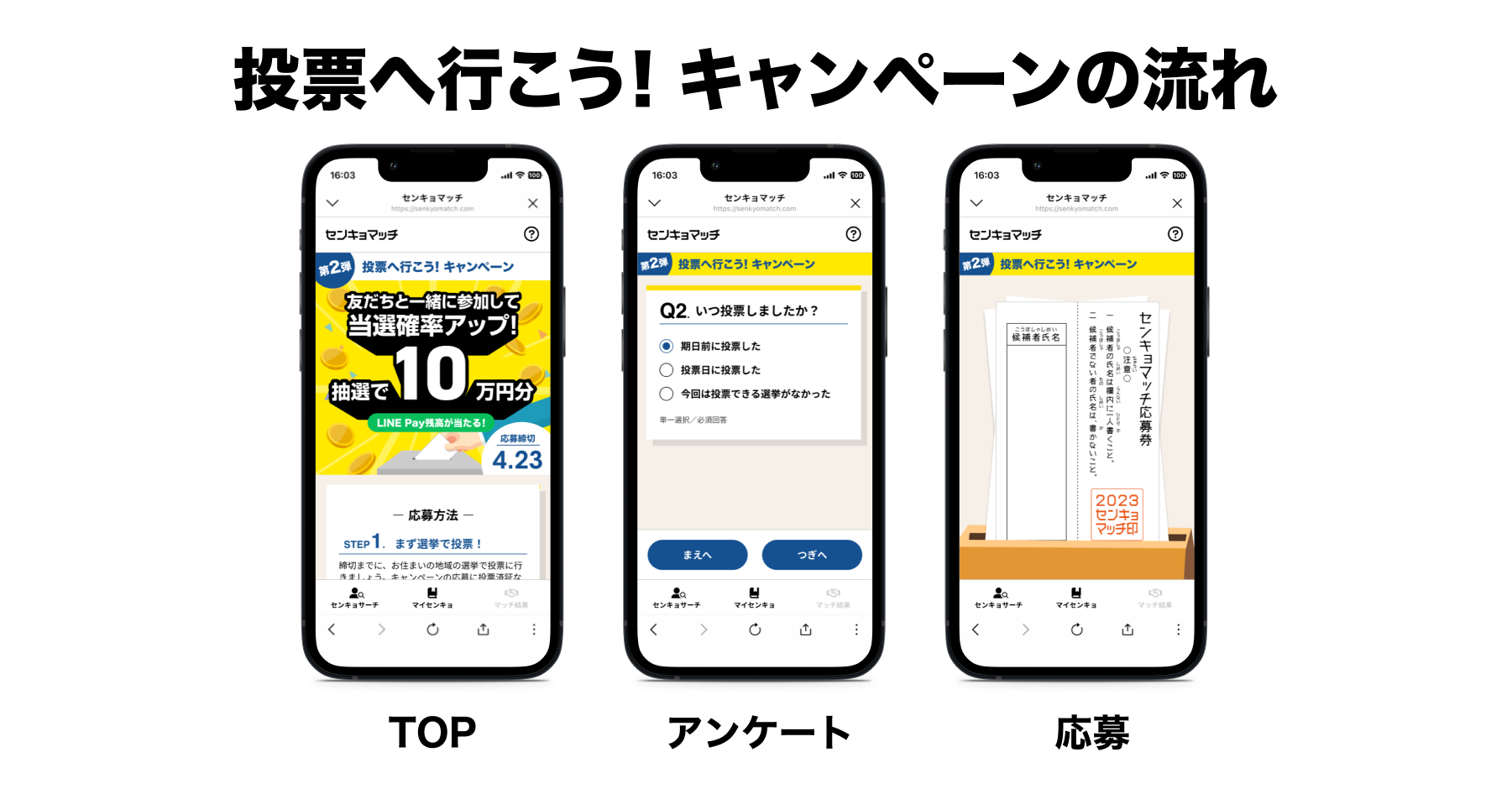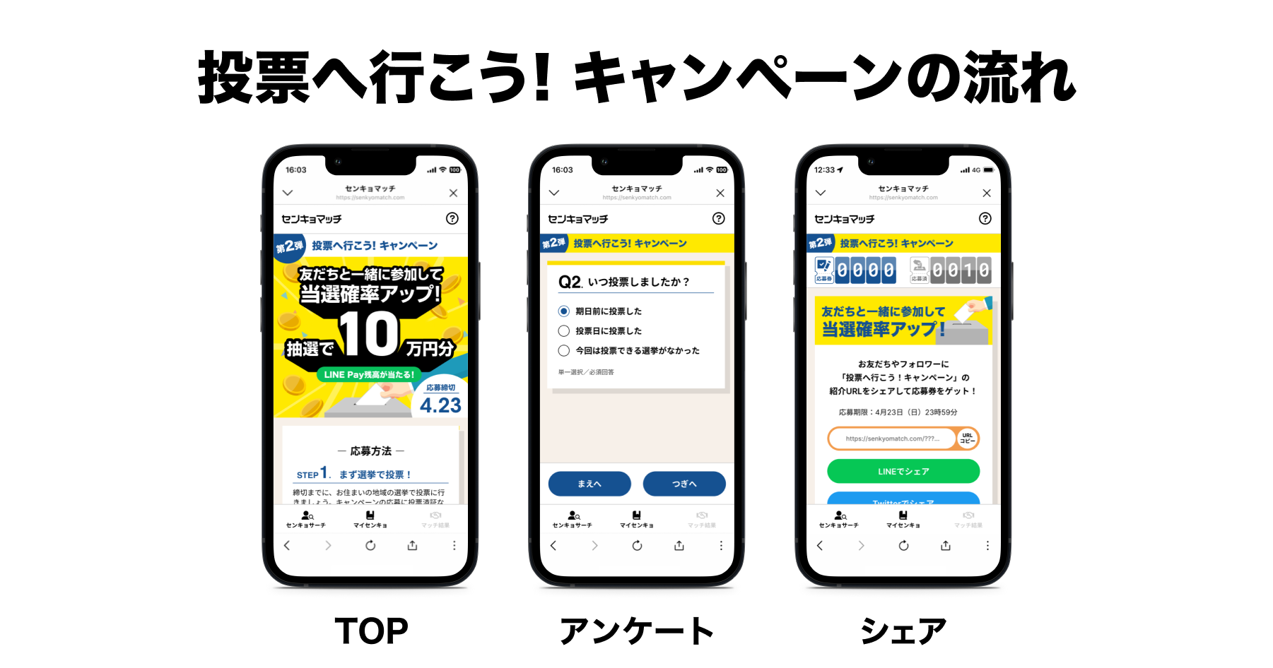 株式会社センキョ(所在地:東京都港区、代表取締役:堀 浩之)は、2023年3月31日(金)から、現在実施中の統一地方選挙で投票した方を対象に、「抽選で10万円分が当たる!投票へ行こう!キャンペーン第2弾」を実施します。