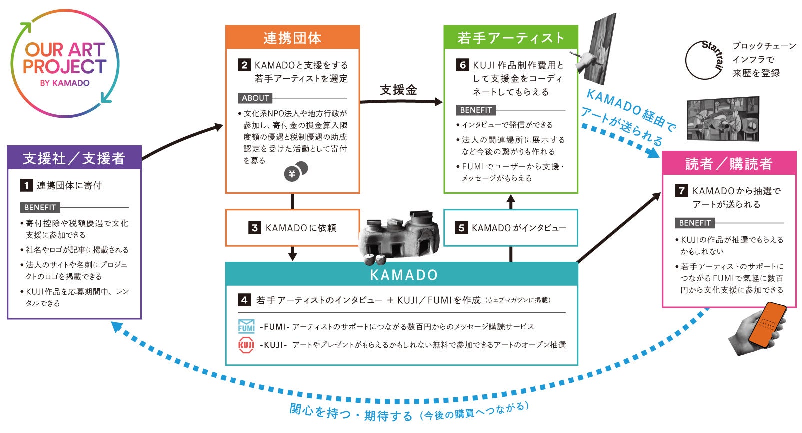 「OUR ART PROJECT BY KAMADO」は、KAMADOと連携団体が法人・個人の「寄付」をコーディネートすることで、若手アーティスト・作家の制作支援を行う今までにない仕組みです。法人は寄付金税制や企業版ふるさと納税を活用して直接支援が行えるだけでなく、一定期間の作品レンタルによるアートの体験が可能となります。個人においても抽選による作品譲渡という形があり、様々な人がアートにふれる機会を生み出します。