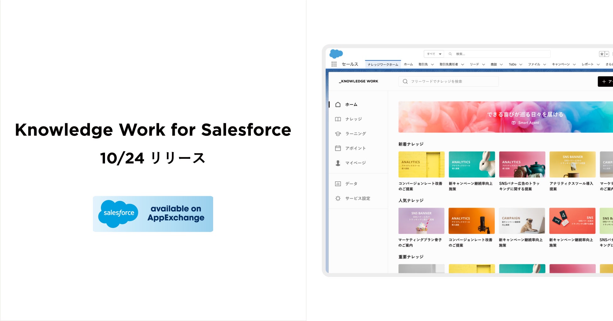 「できる喜びが巡る日々を届ける」をミッションに掲げる株式会社ナレッジワーク(本社:東京都港区、CEO 麻野耕司)は、「Knowledge Work for Salesforce」を株式会社セールスフォース・ジャパンが提供するアプリケーションマーケットプレイス「Salesforce AppExchange(以降、 AppExchange)」にて本日より提供開始いたします。