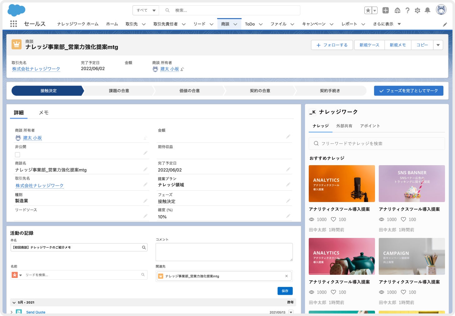 「Salesforce Sales Cloud」内の個別商談画面にて、商談に合った営業資料や営業ノウハウを発見することができます。