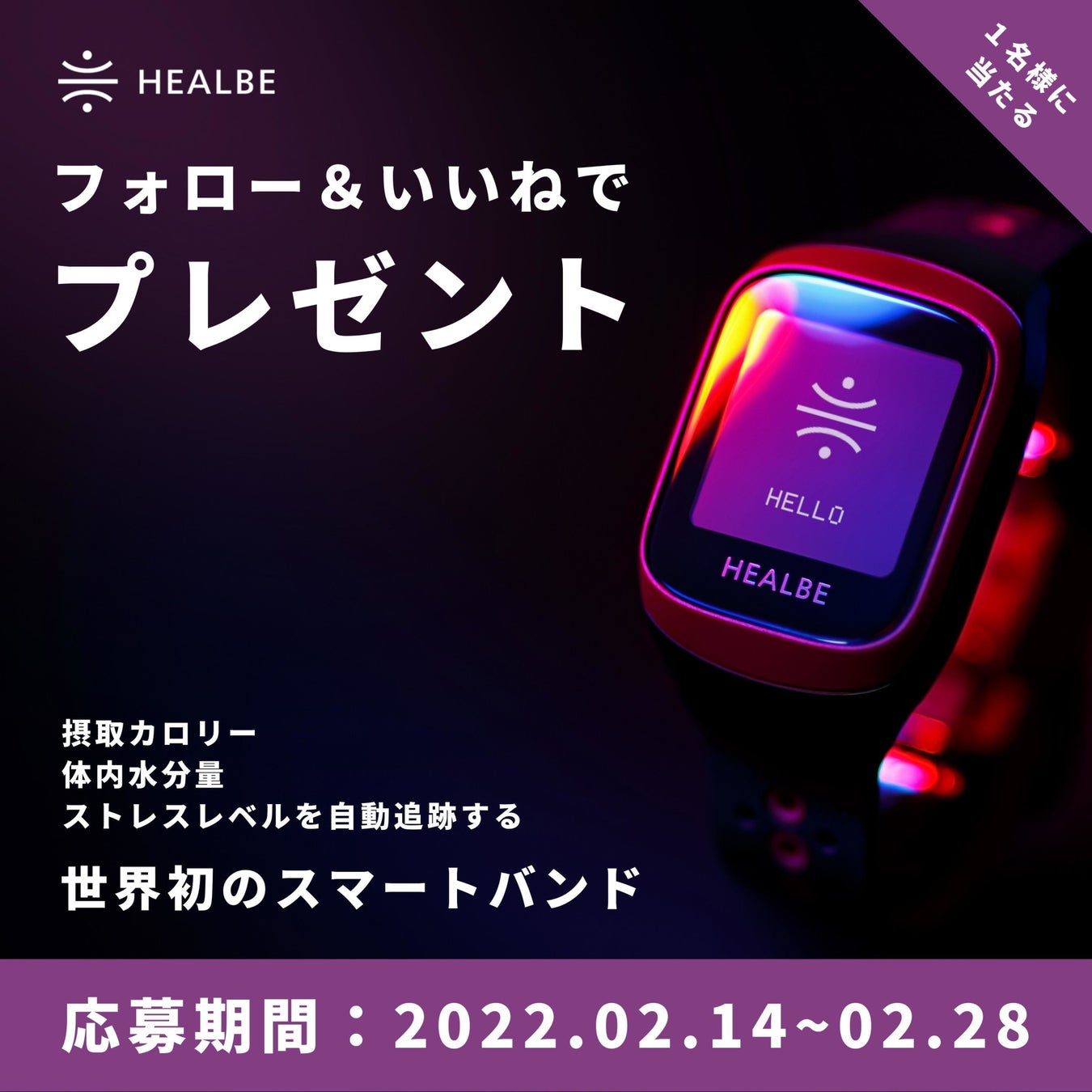【GoBe3】ではバレンタインデーにちなみ〝大切な人に健康をプレゼント”としてHEALBE公式インスタグラムの2月14日投稿をフォロー&いいね!してくれた方から抽選で1名にGoBe3本体が当たるキャンペーンを実施します。