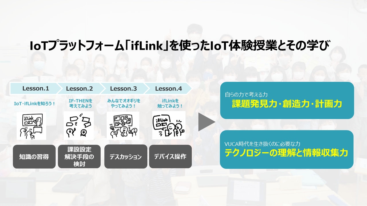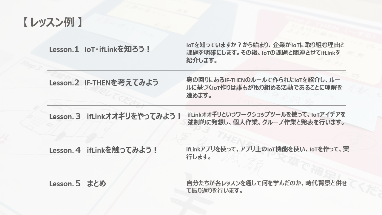 ifLinkを使った授業「ifLink体験授業」の受講者は、5つのレッスンを通して、①最新のIoTとifLinkについて知る、②アイデア発想法を学び、オリジナルのアイデアを発信する、③IoTデバイスを触って動かしてみる、等を体験します。