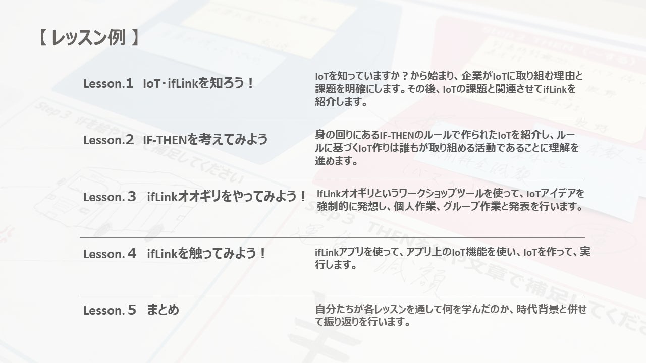 ifLinkを使った授業「ifLink体験授業」の受講者は、5つのレッスンを通して、①最新のIoTとifLinkについて知る、②アイデア発想法を学び、オリジナルのアイデアを発信する、③IoTデバイスを触って動かしてみる、等を体験します。