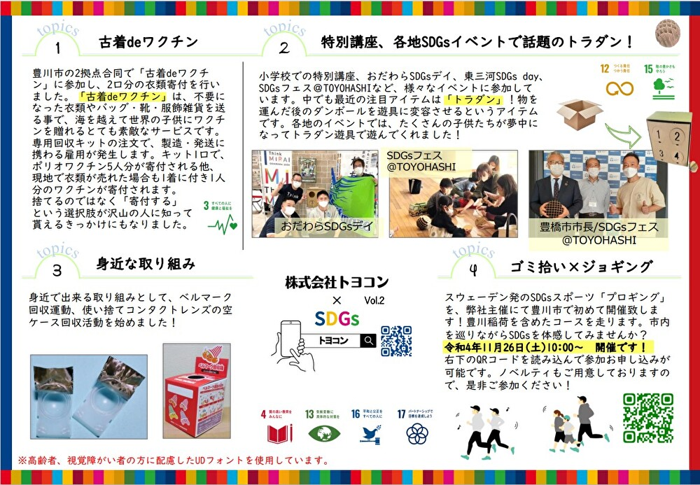 当社は地域清掃の他、災害時に子どもたちの遊び道具となる段ボール遊具の開発や、古着の寄付、ベルマークの回収などを行っています。また、このような取り組み内容をまとめた、トヨコンSDGsレポートを公開しています。