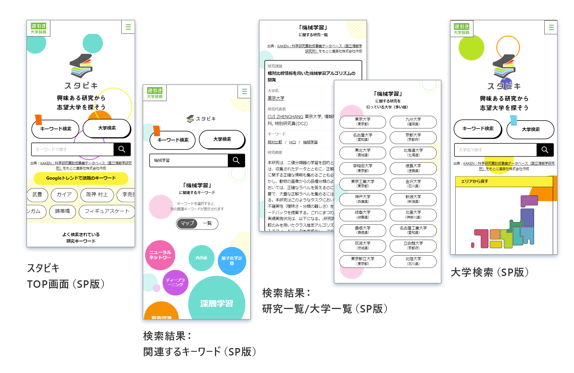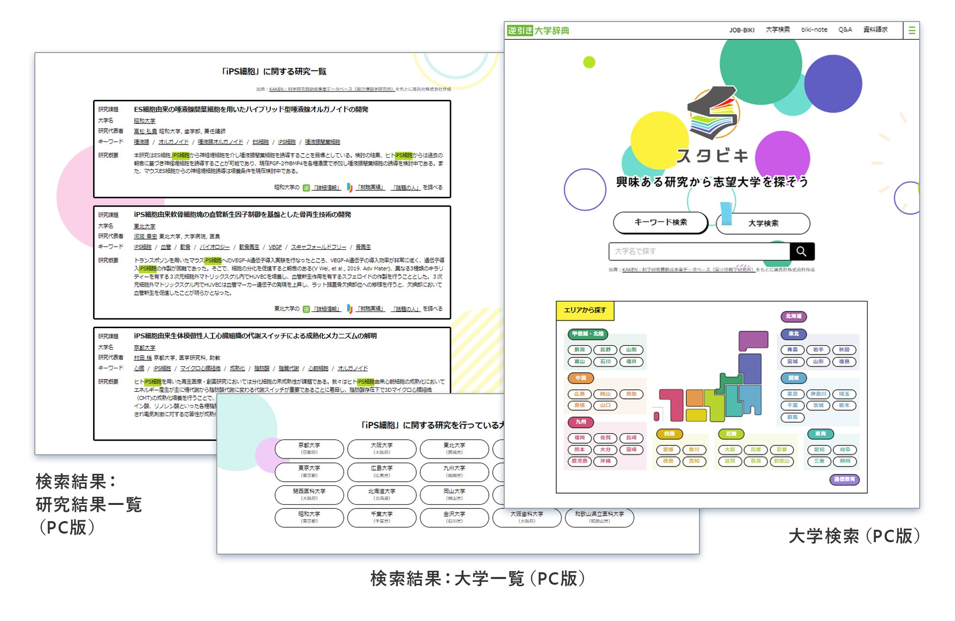 スタビキで利用する研究データはKAKEN:科学研究費助成事業データベース(国立情報学研究所)のAPIを利用して表示しています。研究者用のデータベースシステムを、受験生が興味のある研究テーマから大学・短期大学を簡単に検索できるサービスとして構築したのがスタビキです。トレンドのキーワードから研究結果を検索できる機能もありますので、KAKEN( https://kaken.nii.ac.jp/ )とは違ったアプローチでご利用いただけるものとなっています。