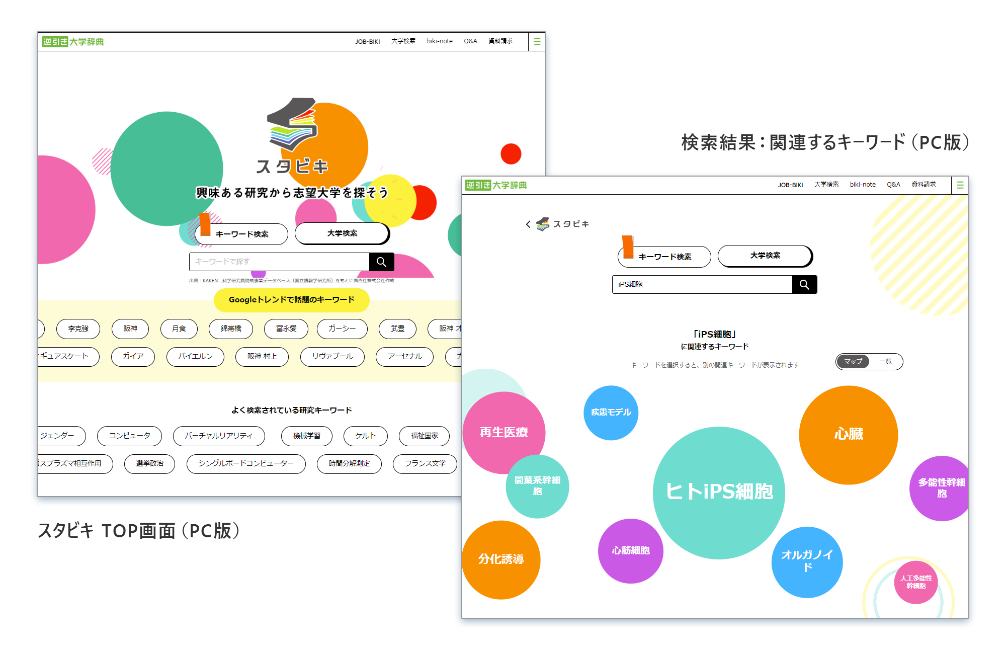 「逆引き大学辞典」では2023年6月からスタートしております、職業から大学を検索できる「JOB-BIKI(ジョブビキ)」に続き、興味のある研究テーマから大学や大学教員を検索できる新サービス「スタビキ」を公開いたしました。