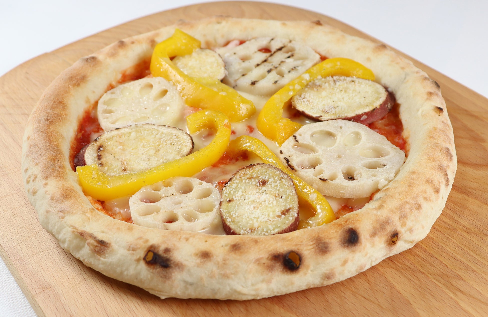 金沢ピザ工房・森山ナポリならではの看板商品のひとつ。 とれたての「加賀レンコン」をはじめとする、季節の加賀野菜をグリルして「ひがし茶屋街老舗味噌蔵」の〈塩麹〉に漬け込み、旨みを引き出しました。大ぶりの野菜には火を通してあるので、ご家庭で焼くときは、チーズが溶けるまでしっかり温めて頂ければOK。見た目からして華やかでヘルシー。希少な加賀野菜の美味しさを、ピザでお気軽にお楽しみ頂けます。
