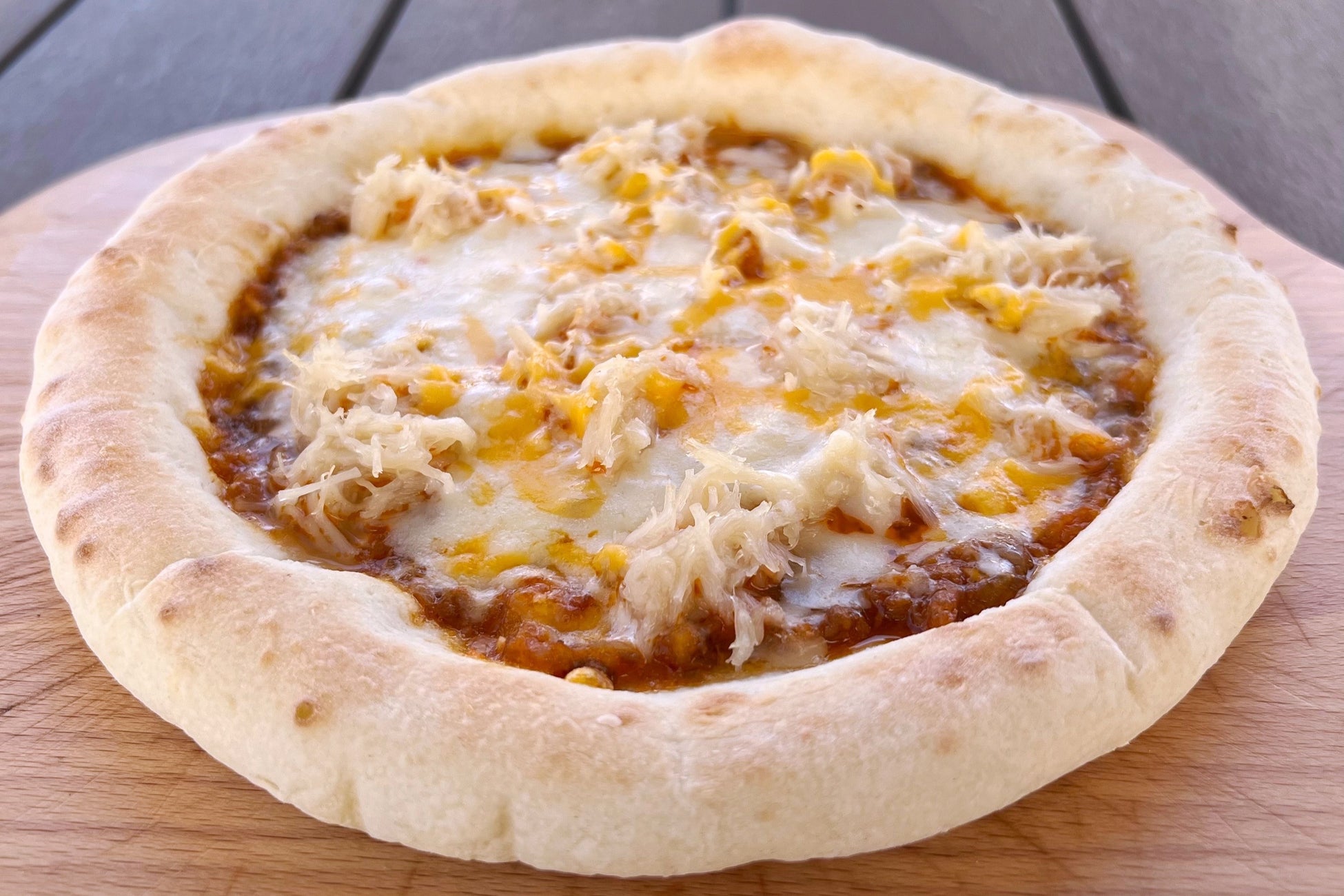 和牛100%の自家製ミートソースにホタテの貝柱をほぐしてトッピング。 ミートソース×貝柱、これまでに無かった美味しさの競演が実現しました!さらに産地にもこだわったチーズをたっぷり。 北海道産ゴーダチーズと、アメリカ産レッドチェダーチーズをミックスし、仕上げには北海道産のパルメザンチーズパウダーをふりかけました。焼き上げると、とろけるチーズの中に新しい美味しさのハーモニーがギュッギュッと濃縮されています。