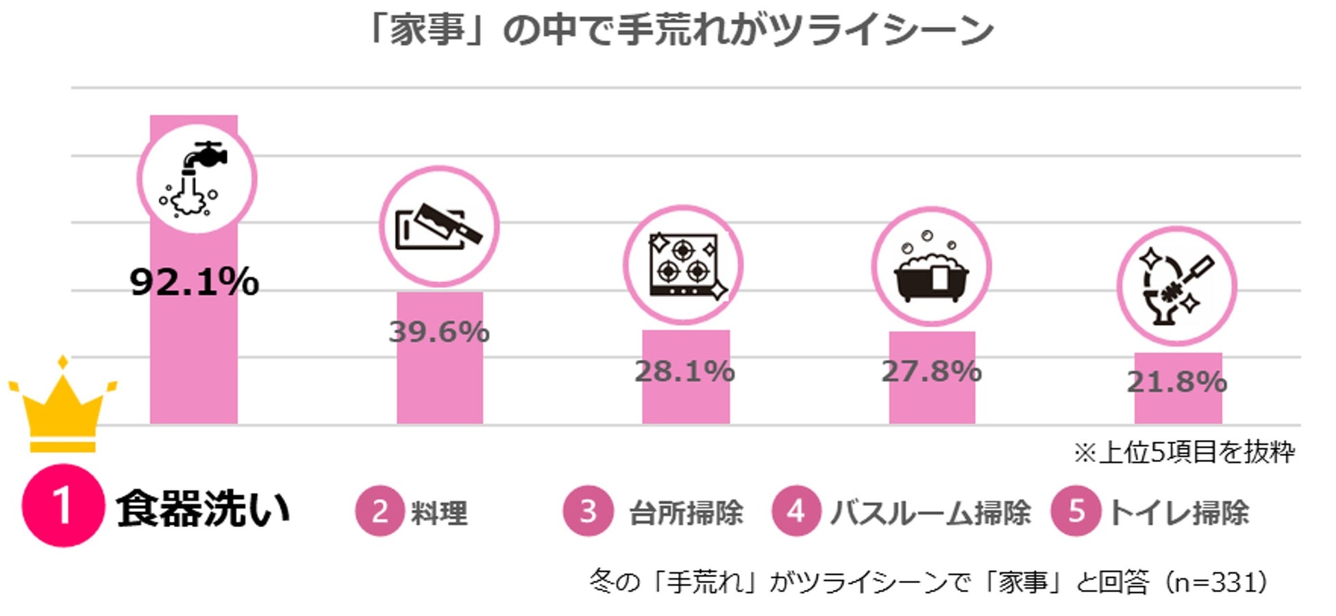 また、「家事」がツライと回答した人に、家事の中の手荒れがツライシーンを聞くと、1位「食器洗い(92.1%)」、2位「料理(39.6%)」、3位「台所掃除(28.1%)」という結果となり、大多数が水仕事が