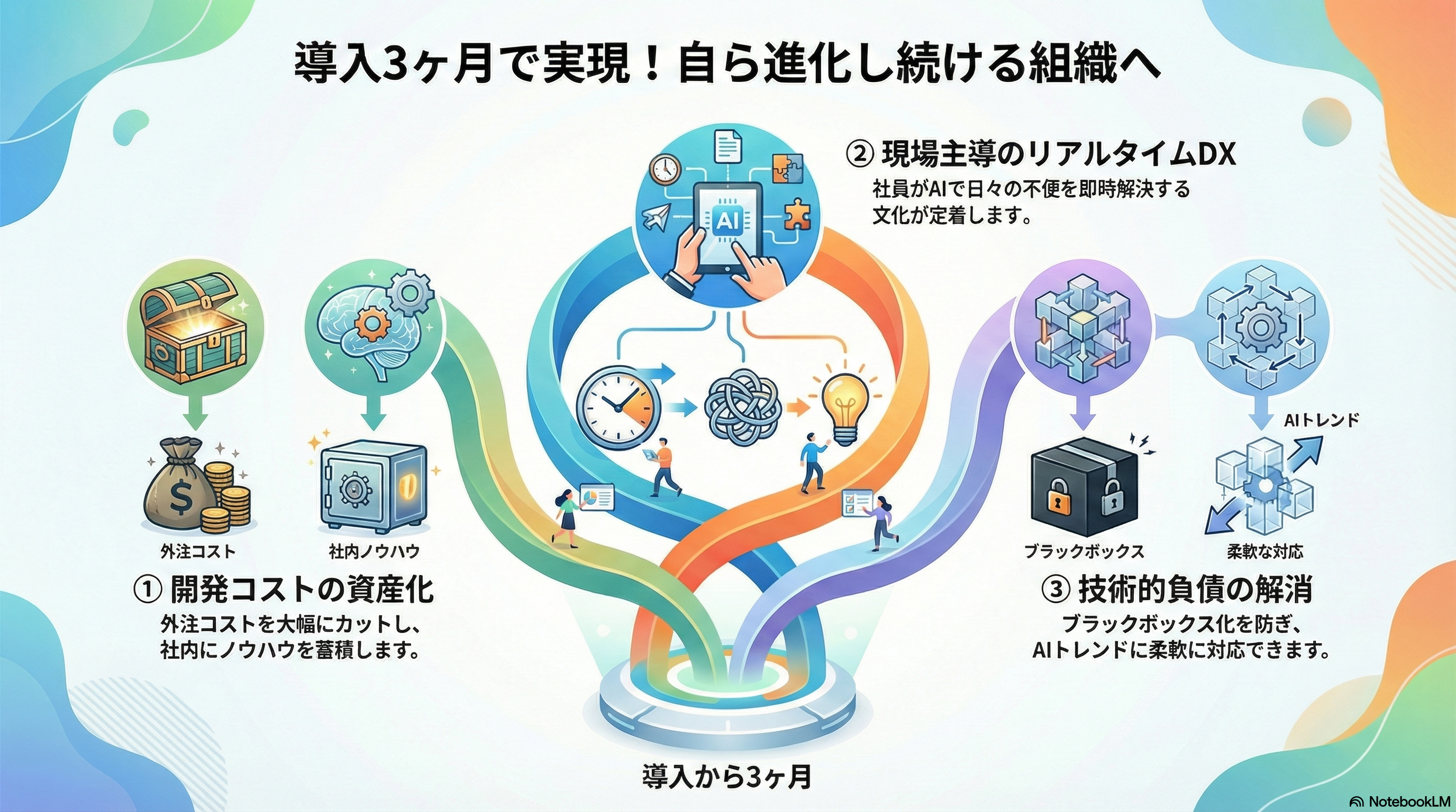 AIエージェントの構築を体験することにより、技術的な仕組みを社員が理解でき、変化の激しいAIトレンドにも柔軟に対応しながら、技術のブラックボックス化を防止することができます。