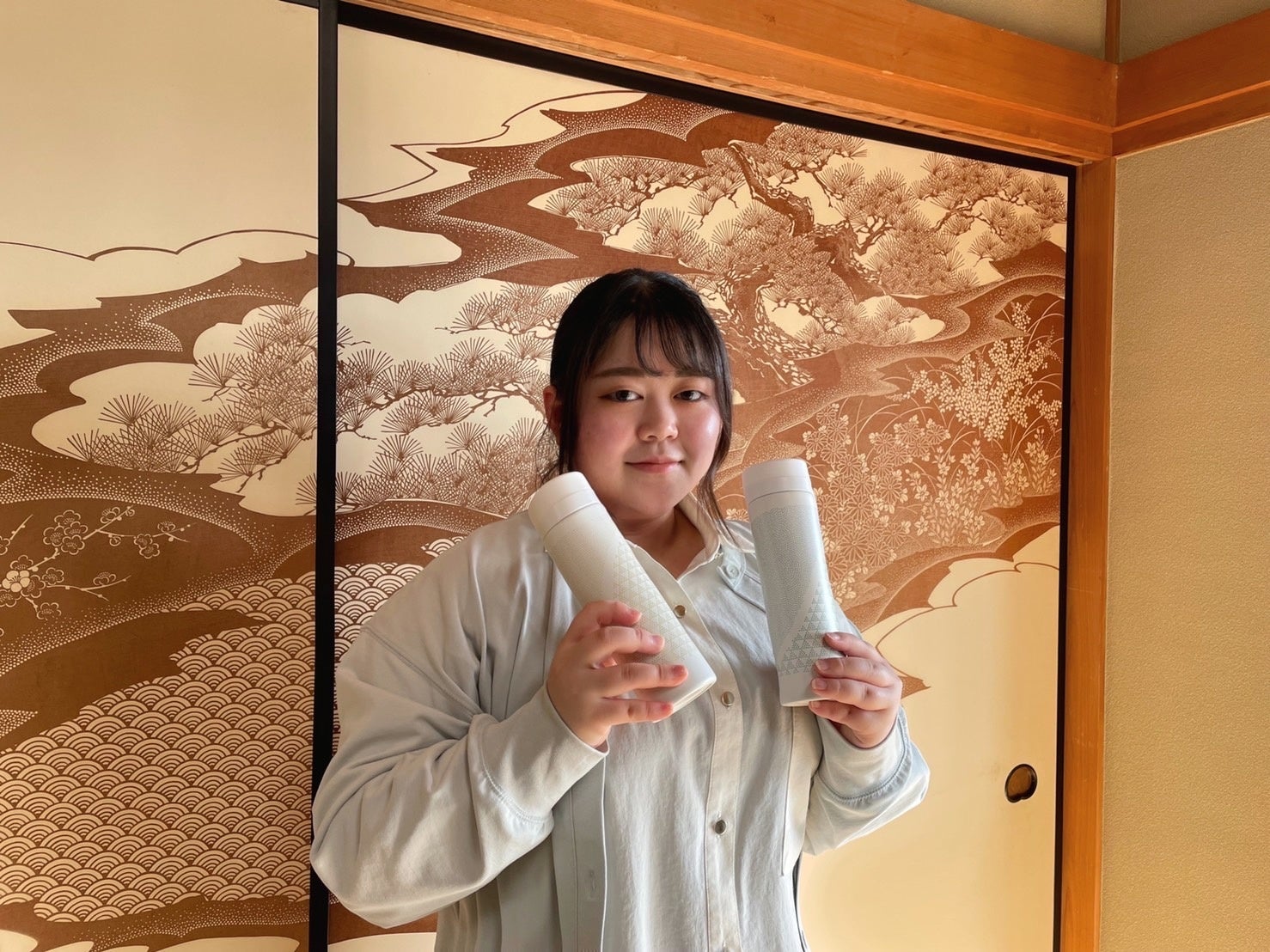 鮫小紋と鱗文様はそれぞれ『守る』意味があります。また、コロナ禍の今こまめな水分補給で乾燥から身を守り、マイボトルを持ち歩くことでペットボトルの消費を減らし環境問題悪化から地球を守ろう、という思いを込めてデザインしました。