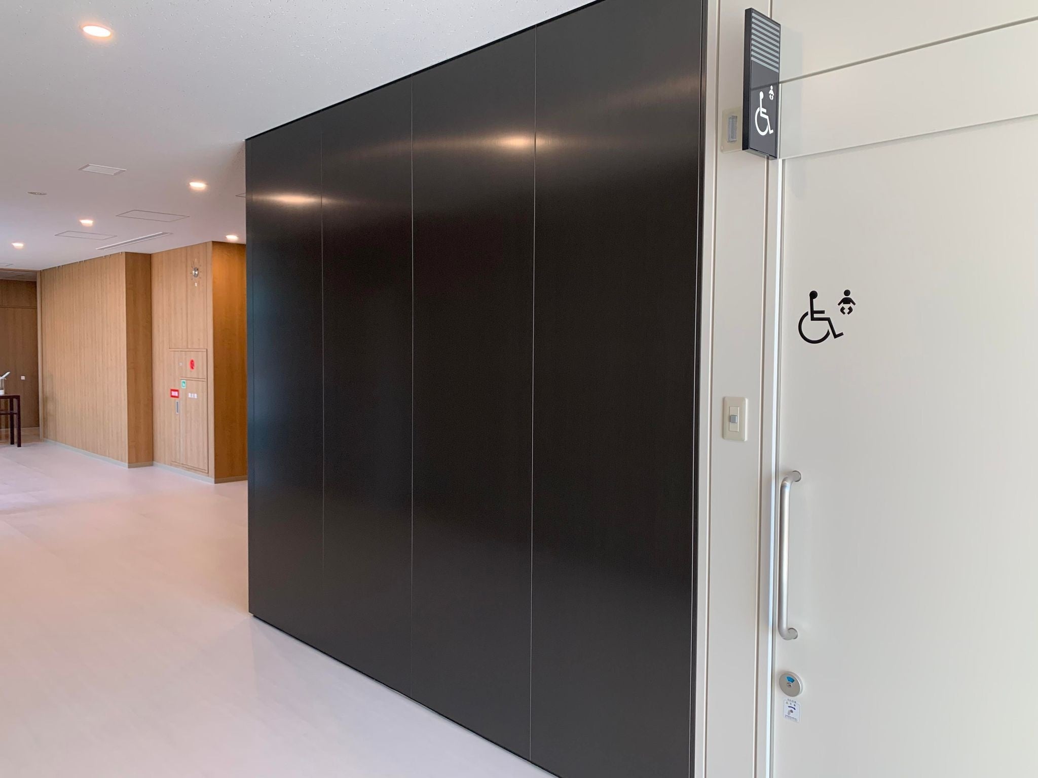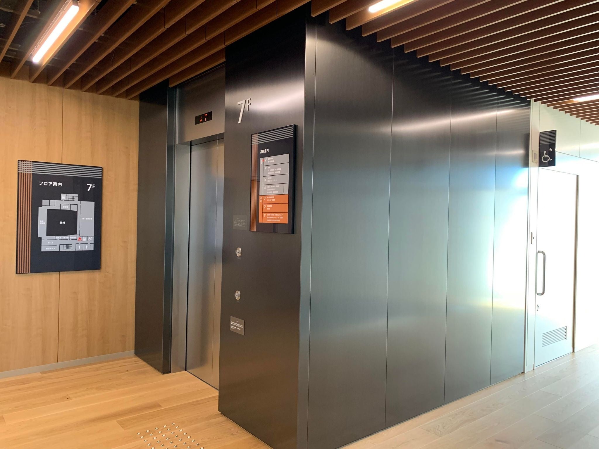 日本製鉄の「FeLuce®」ブラックは、各階(1階から7階)のエレベータ周辺パネルに採用されています。金属素材本来が持つ美しさと持つ質感の高い素材である「FeLuce®」が、その美しさを際立たせるシンプルなデザインで、空間を上質に演出することに貢献しています。