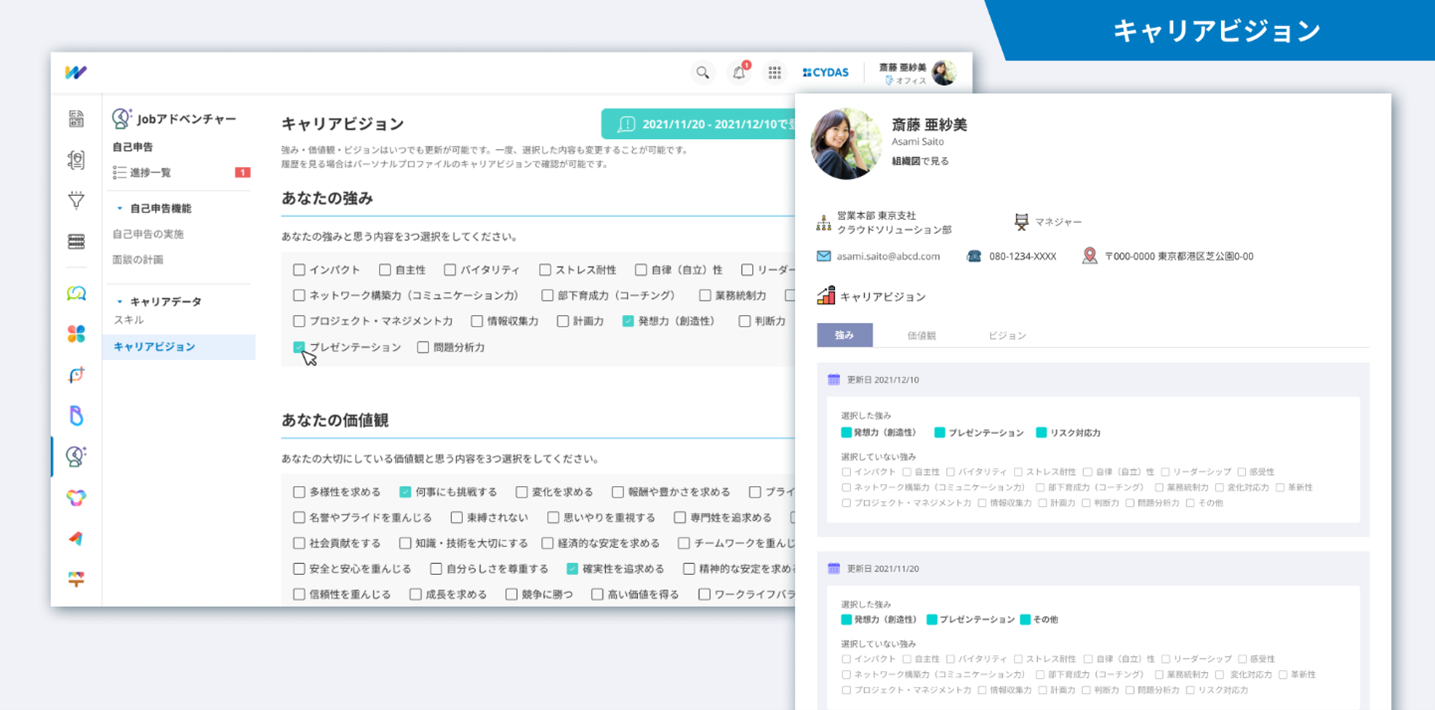 強みや価値観、ビジョンを可視化し、人の成長につなげる機能です。キャリア研修等で明確化された自身のキャリアビジョンをシステム上に入力することでいつでも確認が可能。更新の履歴はしっかりと蓄積されていくため、自身の成長を実感することができます。また、自身のキャリアビジョンを上司と共有し1on1やキャリア面談の場で活用することで、対話が豊かになります。