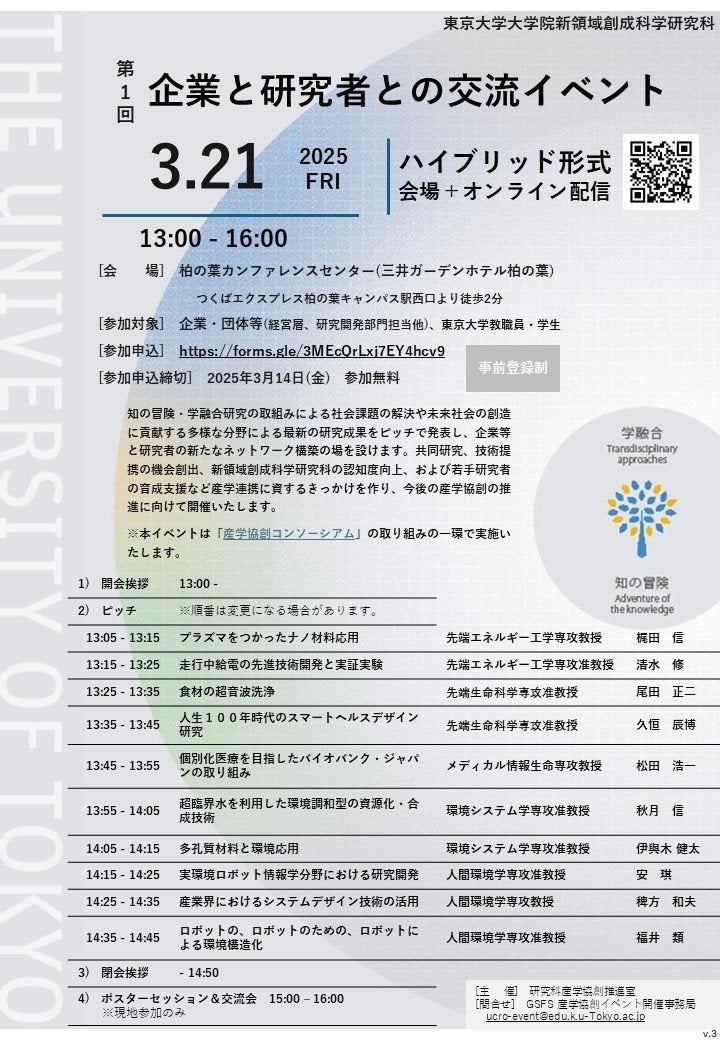 【3/21(金)ハイブリッド開催】企業と研究者との交流イベント(ピッチ&ポスターセッション) 東京大学 大学院新領域創成科学研究科