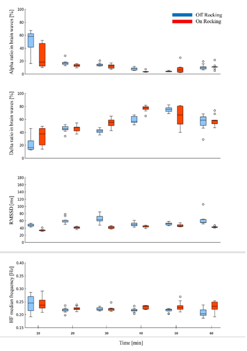 人が就寝する際に、微小な揺動が入眠や深い睡眠を誘発することが知られており、ロッキング現象と呼ばれています。ロッキングは従来、ハンモックやゆりかご等のベッドサイズで行われることが多いですが、今回の研究ではスマート枕「ねむりす」を用いて、頭部のみへの揺動を実施しました。呼吸の倍周期である0.125Hzの揺動が昼寝の睡眠に与える影響について調査した結果、深い睡眠が出現するまでの時間の短縮と深い睡眠の増加がみられました。