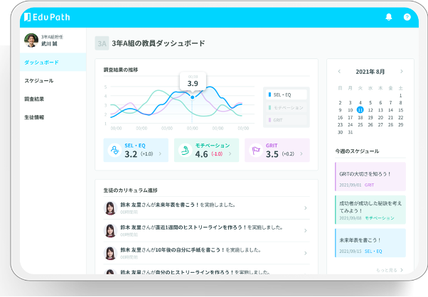 「Edv Path(エデュパス)」では、可視化・数値化した生徒の非認知能力を基に、成長支援を行うための環境作りやカリキュラムを提供いたします。