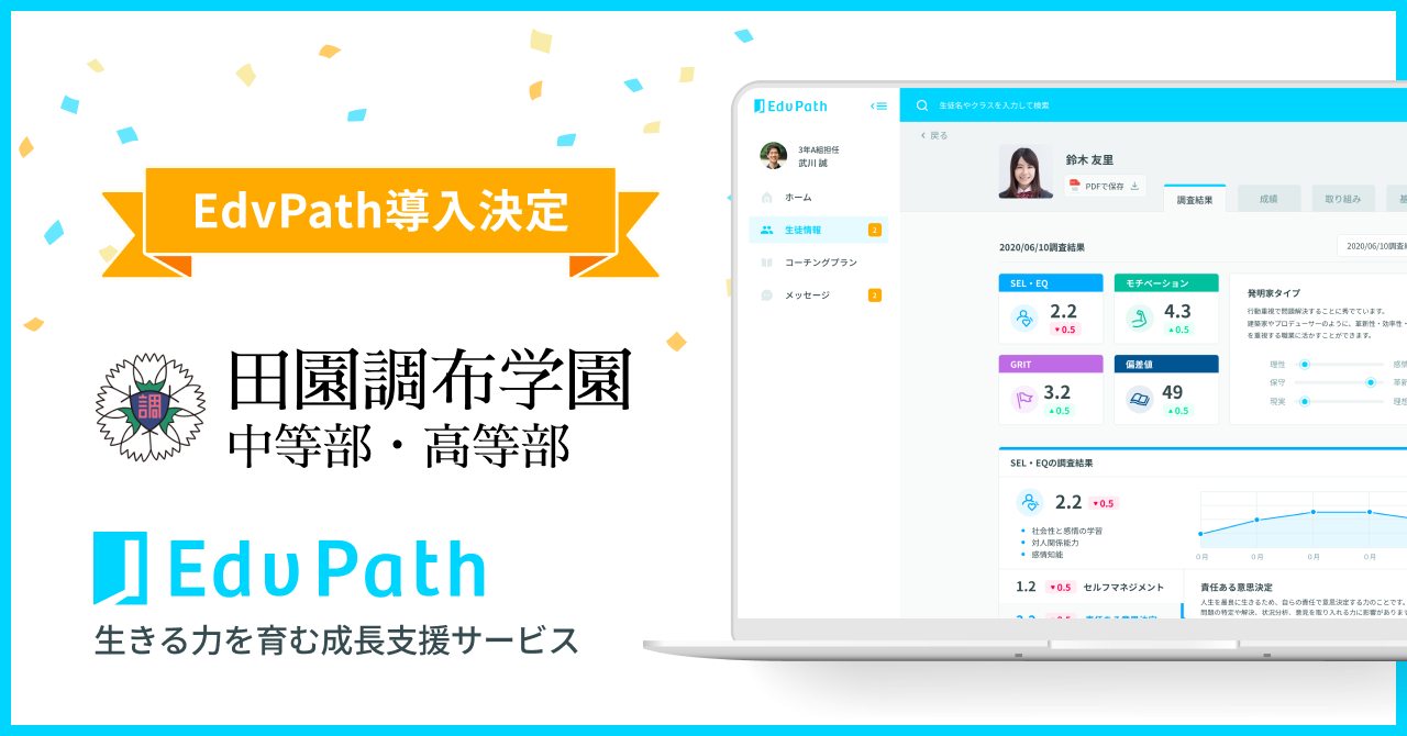 Edv Future株式会社(本社:東京都新宿区、代表取締役:山崎泰正)は、生きる力を育む成長型支援サービス「Edv Path(エデュパス)」が、学校法人調布学園が運営する田園調布学園中等部・高等部(以下、田園調布学園)の中学生を対象に導入(2022年4月開始予定)されたことをお知らせいたします。