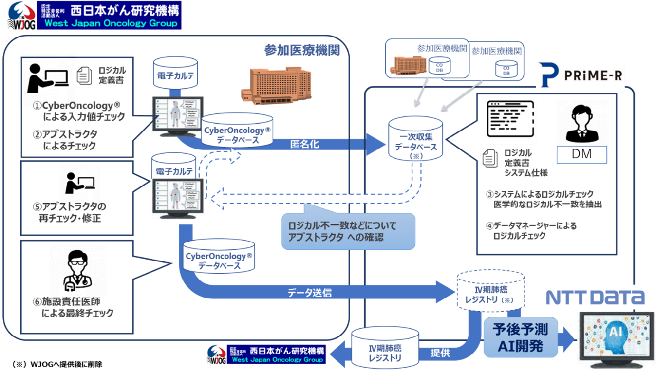 各医療機関の電子カルテと連動したCyberOncology®を用いて入力、抽出された情報により構造化されたデータベースを構築します。高品質なRWDを収集するためにアブストラクタ※3が定期的に医療機関を訪問し、必要なデータの入力を補助します。入力されたデータは、各医療機関のCyberOncology®において匿名化された上で、高セキュアなネットワークを通じて、PRiME-Rのデータセンターへ送信されます。データセンターでは、中央モニタリングによるデータマネジメントを行い、構築した大規模レジストリデータをWJOGへ提供します。