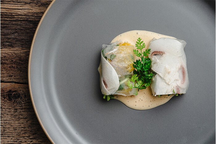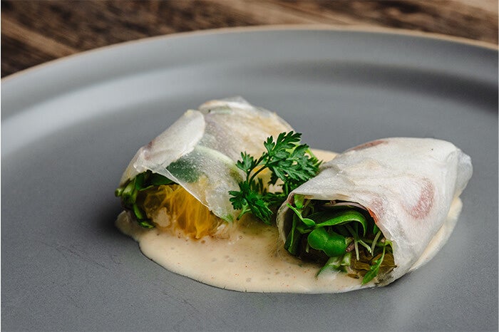 - マッシュルームと江戸前ハーブの生春巻き 豆乳スパイシーソース