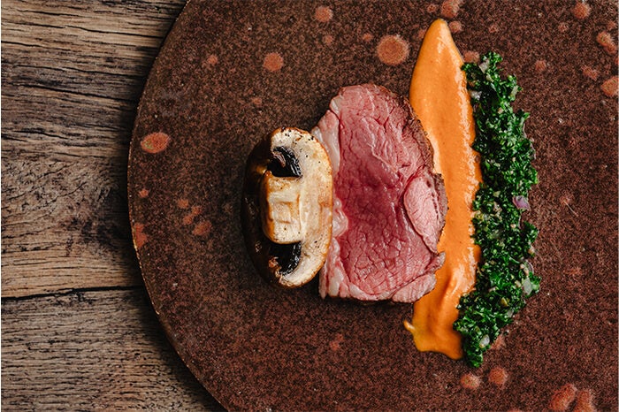 - マッシュルームのローストとラムランプステーキ 〜黄色いロメスコソース・サルサベルデ〜
