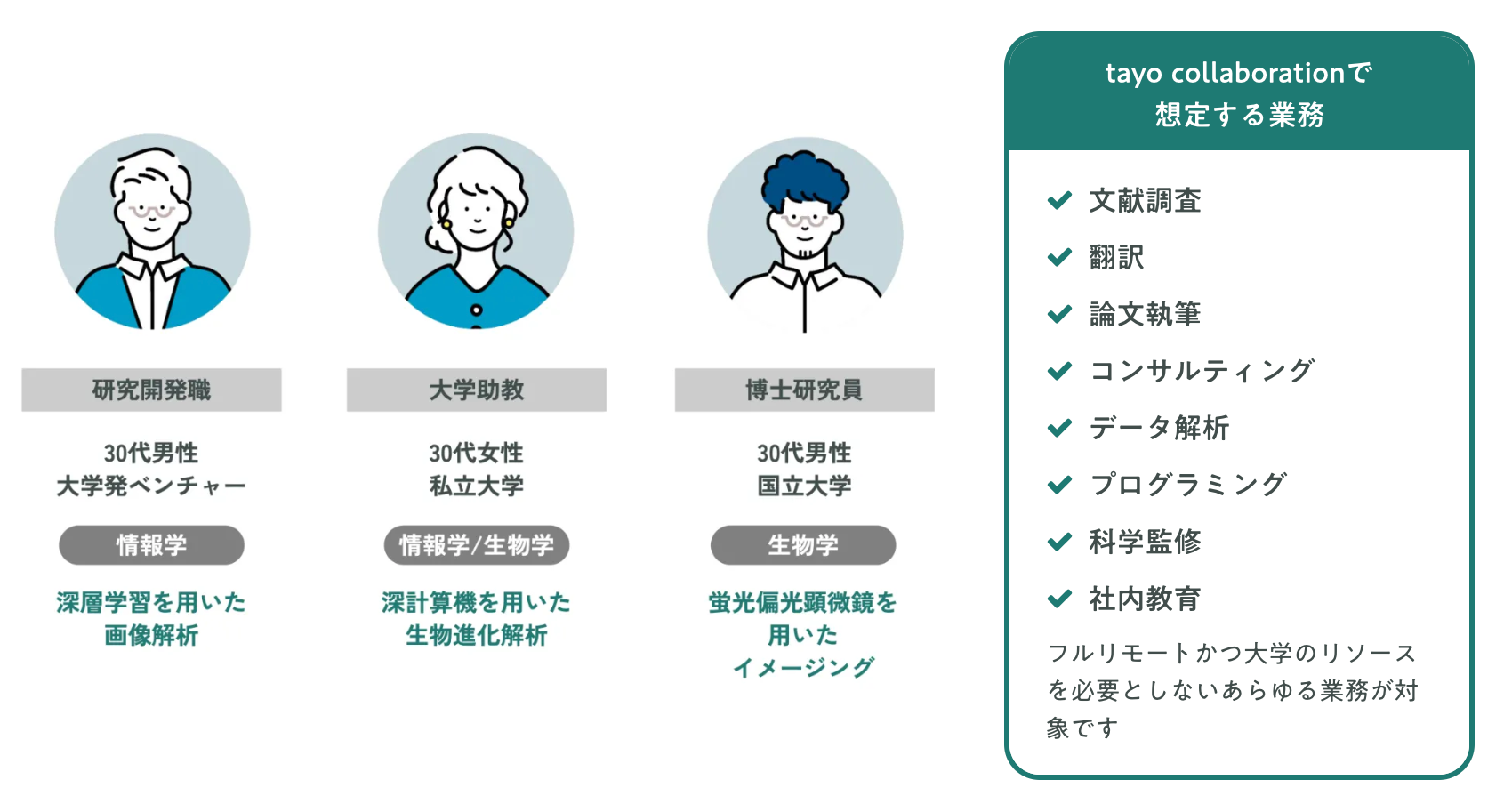 tayo collaborationは日本全国の大学院生や若手研究者、大学教員を副業人材として活用できるサービスです。