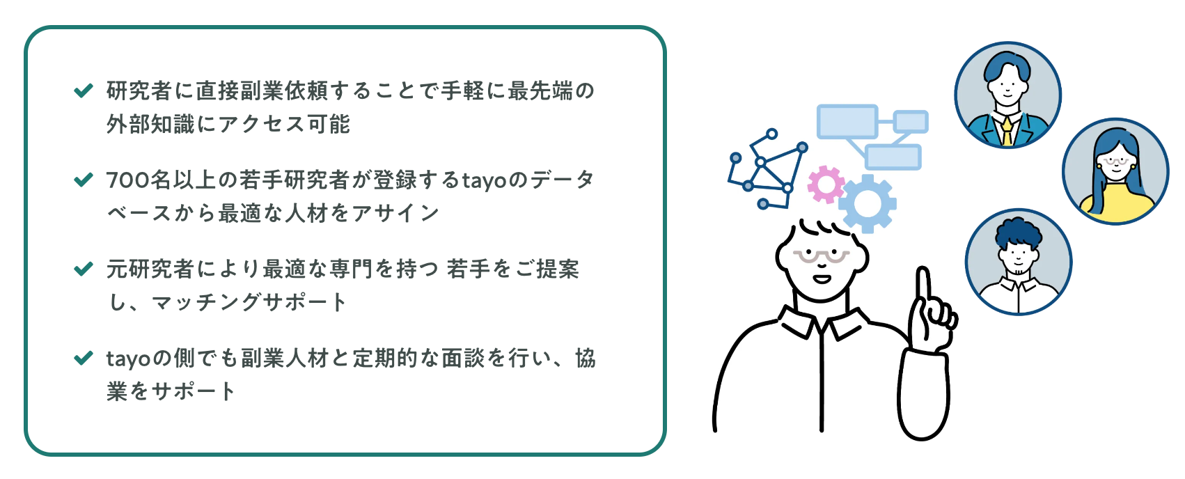 2. 元研究者メンバーによるマッチングサポート:株式会社tayoに所属する元研究者が、 最適な専門を持つ若手をご提案することも可能です。また、副業メンバーの所属する大学・研究機関への副業依頼などの煩雑な手続きも株式会社tayoが代行致します。