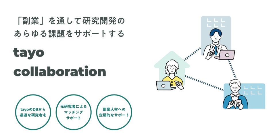 株式会社tayo(本社:神奈川県横浜市、代表取締役:熊谷 洋平)は、本日2023年4月1日(土)に専門知識や技術が必要な企業・研究室と研究者を「副業」によりつなぐ新サービス「tayo collaboration」をリリースいたしました。