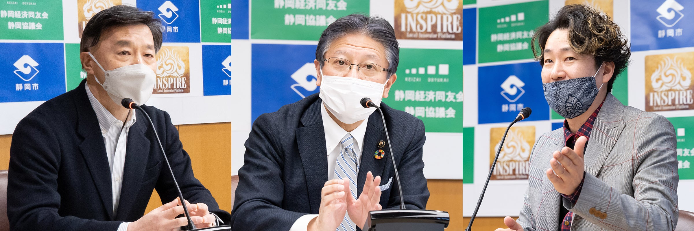 写真左より、江﨑和明氏(静岡経済同友会 静岡協議会 代表幹事)、田辺信宏氏(静岡市長)、谷中修吾氏(一般社団法人INSPIRE 代表理事/BBT大学 経営学部 教授)