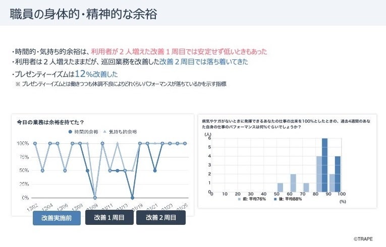 介護における生産性向上ガイドライン作成など、2017年から介護分野の生産性向上のためのさまざまな国の施策づくりで中心的な役割を担い、ウェルビーイングに溢れた介護事業所を創出するために「生産性向上」「働きがい向上」「リーダー育成」の3つを一度に実現することができる生産性向上伴走支援サービス「Sociwell(ソシウェル)」を展開している株式会社TRAPE(本社:大阪府大阪市、代表取締役社長:鎌田大啓)は、公益財団法人いきいき岩手支援財団様より令和5年度介護ロボットの開発・実証・普及のプラットフォーム事業相談窓口における業務アドバイザーを受託し、岩手県内で介護ロボットを導入しようとする3つの介護事業所に対して伴走支援を実施し、成果を生み出すことができましたのでご報告させていただきます。
