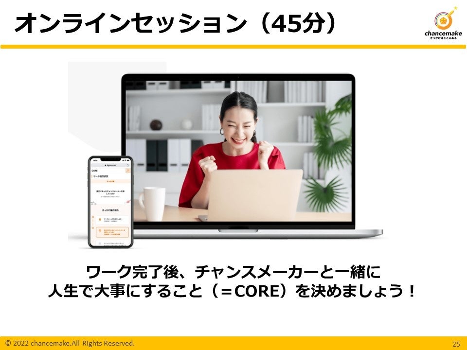 COREは独自のWEBシステムを構築し、完全オンラインで「ワーク+セッション(対話)」を提供しています。