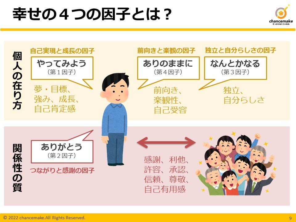 また、chancemakeは日本の幸福学の第一人者 慶應義塾大学大学院SDM 前野隆司教授 を最幸顧問として迎え入れていますが、幸福学では因子分析という手法で多くのデータを解析し、幸せに関する構造を明らかにしていますので、そのエッセンスも伝えてまいります。