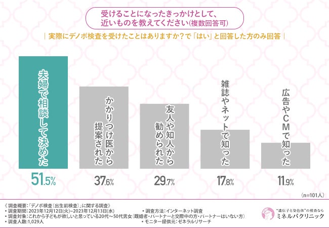 「受けることになったきっかけとして、近いものを教えてください(複数回答可)」と質問したところ、『夫婦で相談して決めた(51.5%)』と回答した方が最も多いという結果になりました。