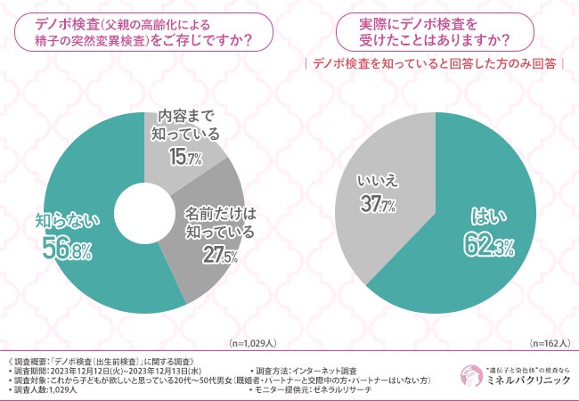 医療法人社団ミネルバ(本社所在地:東京都港区、院長:仲田 洋美)は、これから子どもが欲しいと思っている20代~50代の男性を対象に、「デノボ検査(出生前検査)」に関する調査を実施しました。