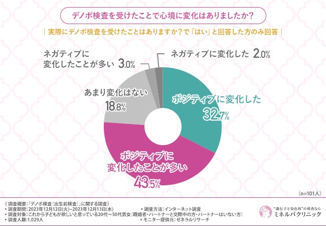 そこで、「デノボ検査を受けたことで心境に変化はありましたか?」と質問したところ、『ポジティブに変化した(32.7%)』『ポジティブに変化したことが多い(43.5%)』という回答結果になりました。