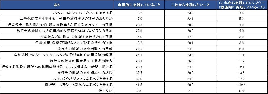 現在意識的に実践していることは、「歯ブラシ・ブラシ・化粧品はなるべく持参する(41.5%)」でした。最も実践できていないことでは「カトラリー」が1位となったことと対照的な結果は興味深いところです。また、現在は実施していないが、今後実施意向が高いと考えられる項目(意識的に実践していることよりも、これから実践したいこととの割合の方が高い項目)をピックアップしてみると、「レンタカーはEVやハイブリッドを指定する」、「二酸化炭素を排出する自動車や飛行機での移動の取りやめ」、「環境保全に取り組む宿泊・観光施設等を利用するツアーの選択」があがりました(表5)。