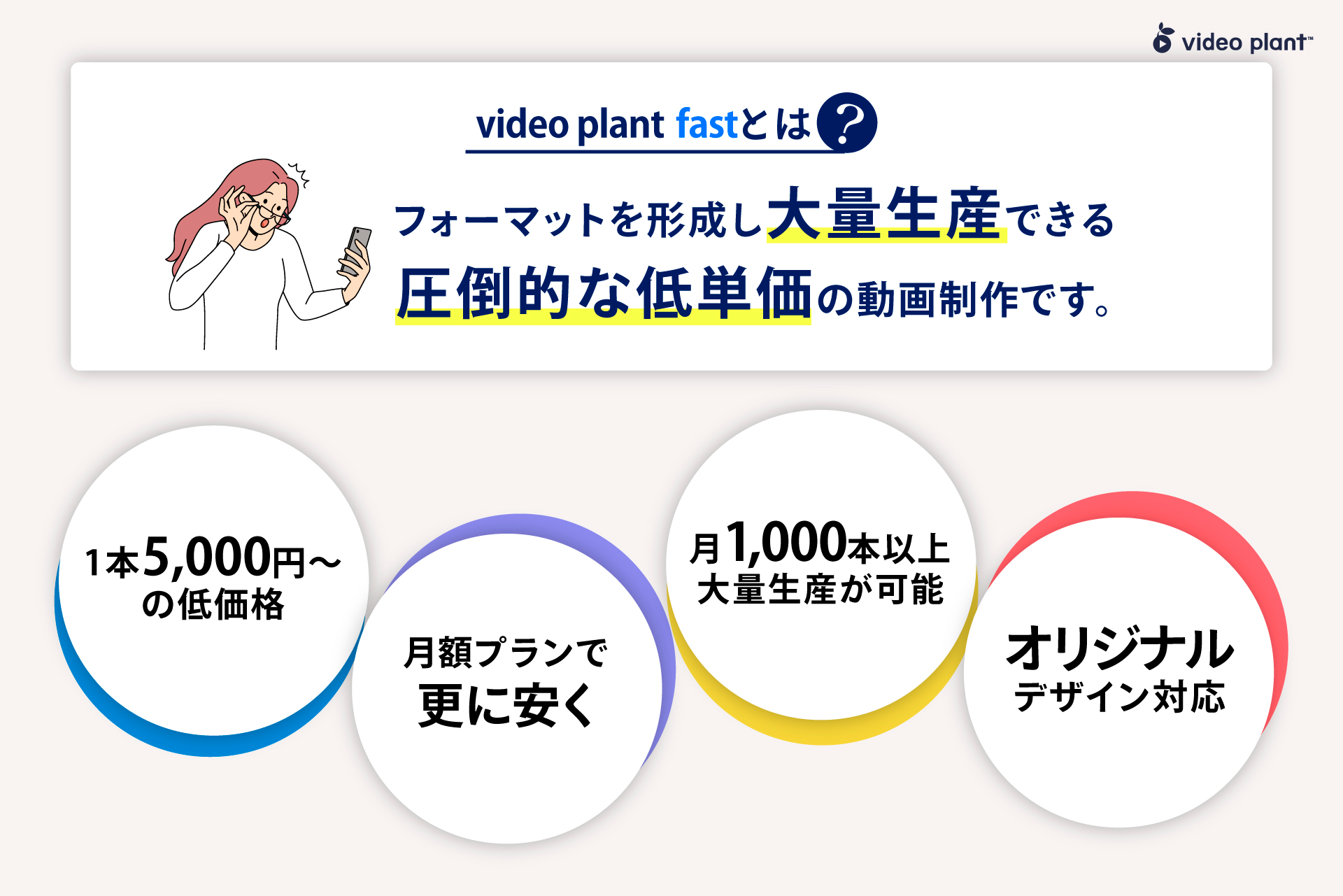 「video plant」よりもたくさんの動画をスムーズに、そして安く欲しいという企業様の声にお応えして、2023年より「video plant FAST」を提供開始します。動画のデザイン・構成は統一し、大量にバリエーション違いを生産したい場合におすすめです。