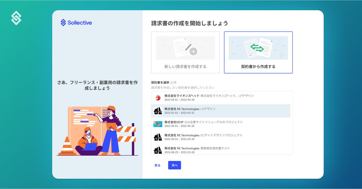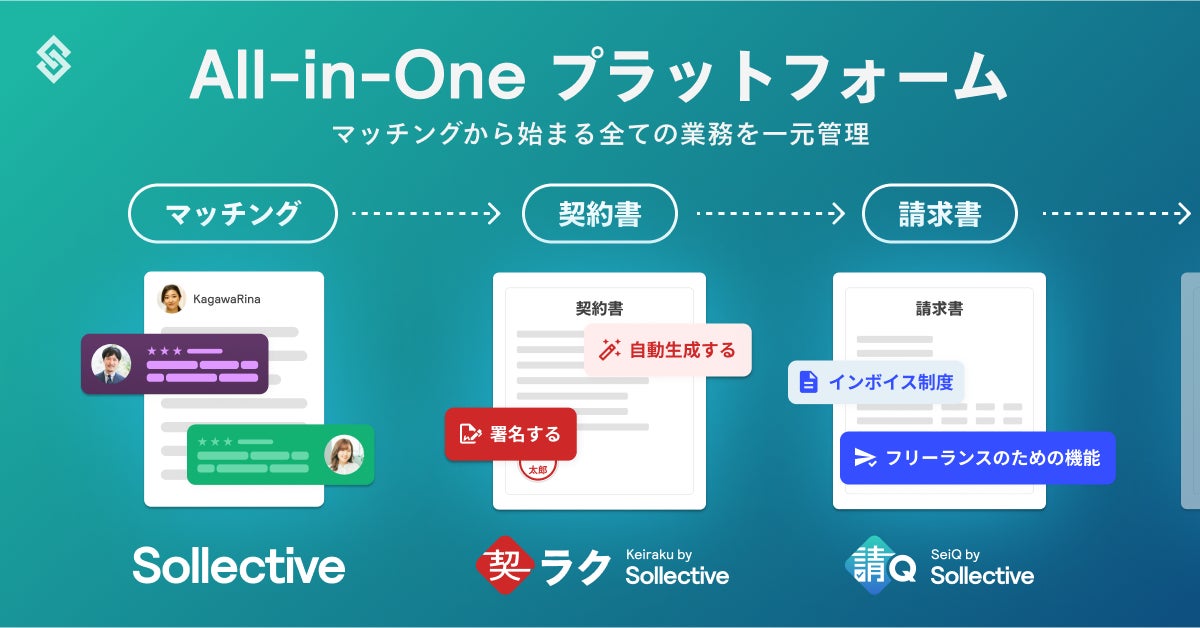 『Sollective』では、2022年3月に提供開始した業務委託契約書作成サービス『契ラク®︎ by Sollective(https://sollective.jp/contracts)』と、『請Q by Sollective』の開始により、契約書作成から請求書の発行がプラットフォーム上で完結できるようになりました。