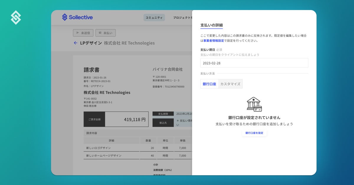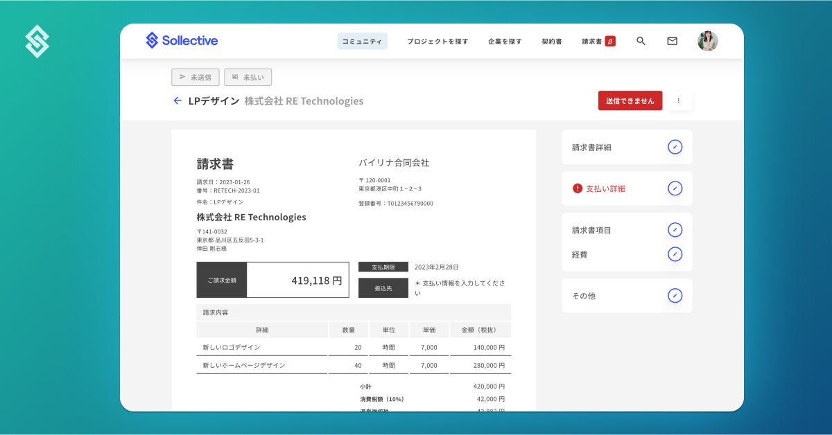 今回リリースした『請Q by Sollective』は、PDF 出力・電子送付の双方に対応した請求書作成サービスで、ユーザーの職種に合わせて、インボイス制度や源泉徴収をはじめとした各種制度に対応できるシステムを構築しています。