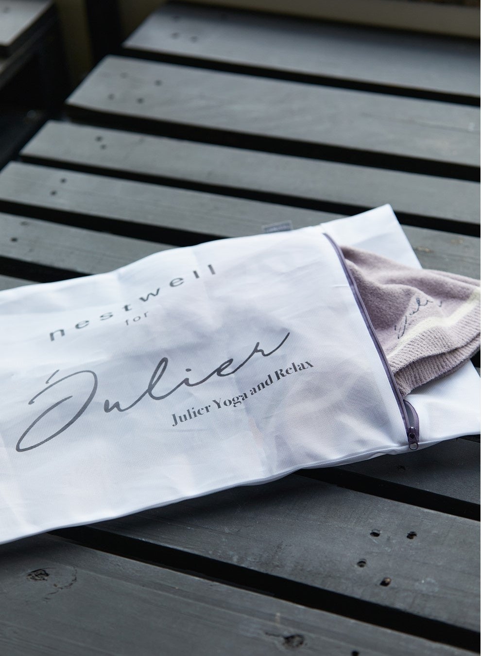 nestwellのアイテムはアパレルやブランケットを購入すると(小物除く)衣類用ネットがついてきます。これはこのネットで洗濯してより長く着てほしいという想いと、さらにこのネットで旅行などのお供として持ち運んで旅先でも身に着けてほしいという想いが込められています。コラボレーションラインでもオリジナルデザインの衣類用ネットを一緒にお届けします。